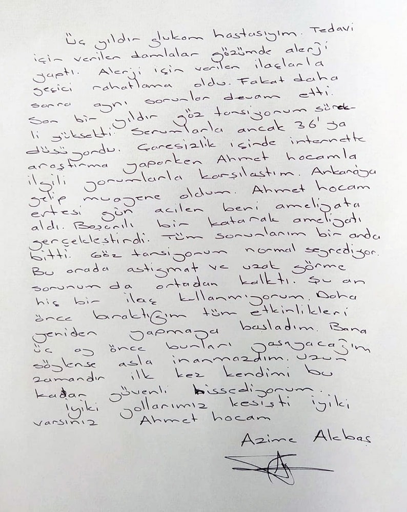 Üç yıldır glokom hastasıyım. Tedavi için verilen damlalar gözümde alerji yaptı. Alerji için verilen ilaçlarla geçici rahatlama oldu. Fakat daha sonra aynı sorunlar devam etti. Son bir yıldır göz tansiyonum sürekli yüksekti. Serumlarla ancak 36'ya düşüyordu. Çaresizlik içinde internette araştırma yaparken Ahmet hocamla ilgili yorumlarla karşılaştım. Ankara'ya gelip muayene oldum. Ahmet hocam ertesi gün acilen beni ameliyata aldı. Başarılı bir katarakt ameliyatı gerçekleştirdi. Tüm sorunlarım bir anda bitti. Göz tansiyonum normal seyrediyor. Bu arada astigmat ve uzak görme sorunum da ortadan kalktı. Şu an hiç bir ilaç kullanmıyorum. Daha önce bıraktığım tüm etkinlikleri yeniden yapmaya başladım. Bana üç ay önce bunları yaşayacağım söylense asla inanmazdım. Uzun zamandır ilk kez kendimi bu kadar güvenli hissediyorum. İyi ki yollarımız kesişti iyi ki varsınız Ahmet hocam.